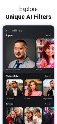 Duce-ți prezența online la un nou nivel cu generatorul de avatare AI inclus în AI Arta. Prin simpla încărcare a fotografiilor tale, puternicul algoritm de creare transformă imaginile obișnuite în avatare uluitoare, cu o multitudine de filtre AI. Devino personajul principal al anime-ului sau benzii desenate preferate sau călătorește instantaneu în universuri fictive captivante. Nu în ultimul rând, găsește-ți inspirația explorând o galerie vastă de artă AI creată de utilizatori din întreaga lume. Descoperă perspective noi și lasă-te ghidat de creativitatea globală pentru a da naștere propriilor tale viziuni artistice cu AI Arta.