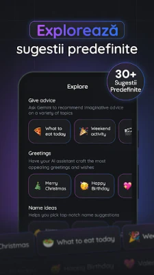 De la obținerea de răspunsuri imediate la cele mai diverse întrebări și până la explorarea unei biblioteci extinse de sugestii predefinite, Gemmy AI vă oferă suport continuu. Angajați-vă în conversații dinamice cu asistentul AI, transformând conceptele abstracte în realitate, fie că doriți să creați povești captivante, poezii emoționante sau idei revoluționare. Aveți libertatea de a salva informațiile esențiale și de a partaja cu ușurință istoricul dialogurilor, facilitând colaborarea. Conținutul său este actualizat periodic, asigurându-vă acces la cele mai proaspete și relevante surse de inspirație, în timp ce confidențialitatea datelor dumneavoastră este garantată prin măsuri de securitate robuste.