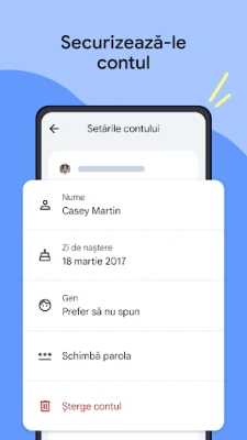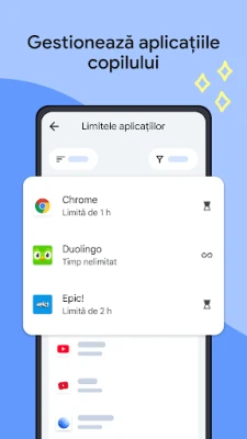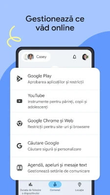 Controlați cu precizie experiența digitală a copilului, având flexibilitate deplină asupra aplicațiilor și conținutului accesat. Cu Family Link, aveți posibilitatea de a seta limite individuale de timp pentru fiecare aplicație, oferind, în același timp, acces nelimitat la instrumentele educaționale sau la aplicațiile frecvent utilizate. Blocați cu ușurință aplicațiile considerate nepotrivite și configurați controale parentale avansate pentru serviciile Google precum Chrome, Play, YouTube și Căutare. Aprobați noile aplicații, gestionați permisiunile pentru site-uri și aplicații, și asigurați-vă că informațiile cu caracter personal și setările contului copilului sunt protejate și gestionate în siguranță, inclusiv posibilitatea de a schimba parola sau de a edita datele.*