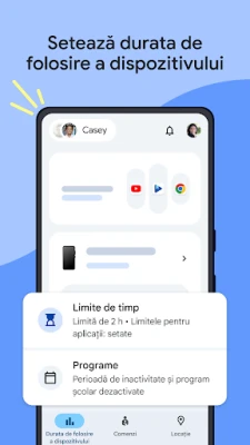 Family Link oferă părinților instrumentele esențiale pentru a naviga cu încredere în lumea digitală alături de copii. Descoperiți modalități inteligente de a încuraja obiceiuri online sănătoase, adaptând timpul petrecut pe dispozitive nevoilor unice ale fiecărui copil. Cu Family Link, puteți stabili limite zilnice de utilizare, configura programe specifice pentru orele de școală și perioadele de repaus, asigurându-vă că micuții își găsesc echilibrul perfect între activitățile online și cele offline. Construiți un mediu digital structurat, care promovează învățarea și explorarea responsabilă.