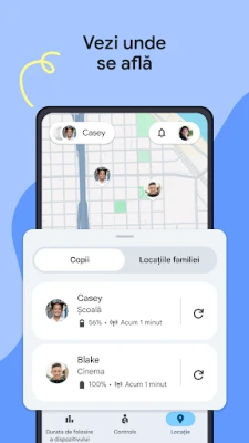 Obțineți liniște sufletească știind unde se află membrii familiei. Family Link vă permite să localizați copiii pe o hartă, cu condiția ca dispozitivul lor să fie pornit și conectat. Primiți notificări importante, cum ar fi momentul în care copilul sosește sau pleacă dintr-o locație prestabilită. Pe lângă siguranța locației, puteți verifica starea bateriei dispozitivelor și chiar să le apelați. Family Link este un aliat de încredere în crearea unui spațiu online sigur și gestionat, oferind instrumentele necesare pentru a îndruma copiii spre o utilizare responsabilă a internetului, conștientizând că siguranța online este un efort continuu și o discuție deschisă în familie.