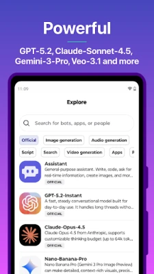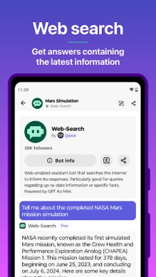 Poe vă invită să explorați un ecosistem vibrant, cu peste un milion de boți personalizați. Angajați-vă în învățarea unei limbi noi, aprofundați orice subiect, discutați direct cu documente încărcate precum PDF-uri și imagini, căutați cele mai recente știri globale sau chiar purtați conversații naturale cu personaje fictive preferate. Aveți puterea de a vă construi și partaja propriile chatbot-uri personalizate, capabile să genereze planuri de studiu, să creeze playlist-uri Spotify, să execute cod Python sau orice altceva vă imaginați, în mai puțin de un minut. Adăugați baze de cunoștințe personalizate pentru experiențe unice și împărtășiți-vă creațiile cu milioane de utilizatori Poe, deschizând calea către inovația colaborativă și o experiență AI impecabilă printr-o interfață ușor de utilizat.